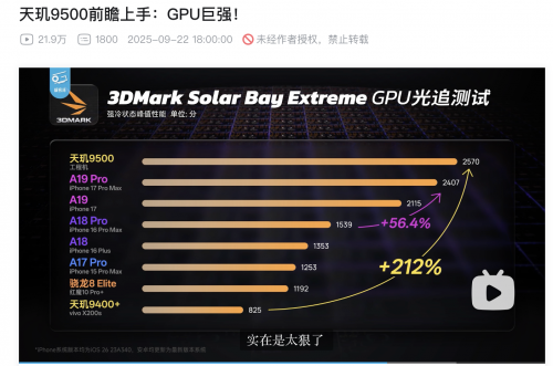极客湾Geekerwan 称赞天玑9500的GPU时称:“实际上这颗GPU的光追性能确实提升巨大,Solar Bay Extreme甚至超过了2570分,苹果今年提升超过50%我们都觉得很离谱了,发哥这是翻了3倍,甚至比苹果还强,这实在是太狠了。”